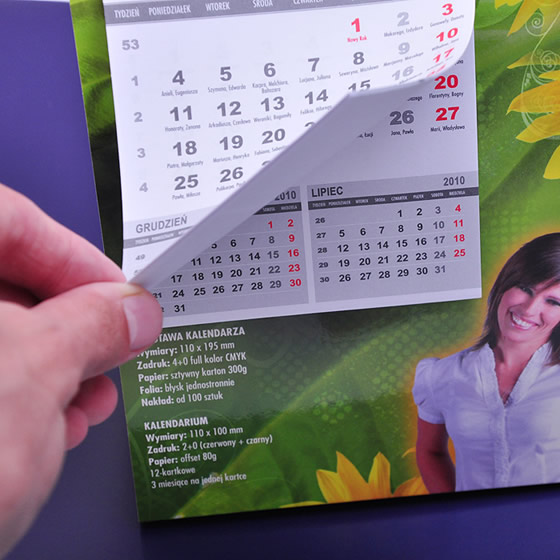 190x168mm (po złożeniu), zrywane kalendarium zawierające najistotniejsze informacje jak numery tygodni oraz imieniny;