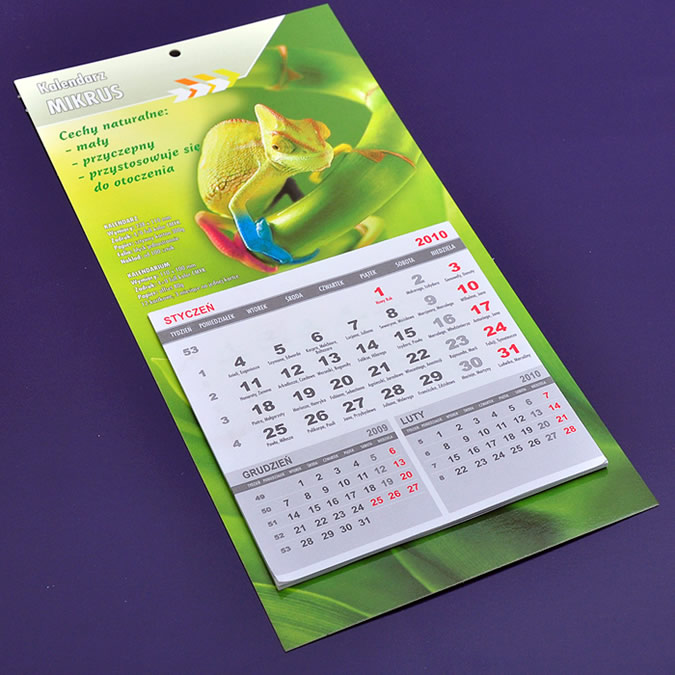 główka kalendarza drukowana jest techniką offsetową full kolor (CMYK), na sztywnym kartonie 300g/m2, foliowana folią błysk, zadruk full kolor pozwala na dowolne opracowanie graficzne, czyli umieszczenie znaków firmowych, zdjęć, tekstów w dowolnych kolorach. Opcjonalnie możliwość zastosowania kolorów Pantone (np. srebrny, złoty)